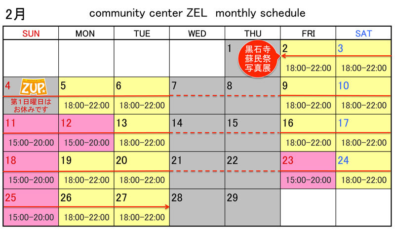 2/4(日) 第一日曜日は休館です (15:00-17:00 ZUP)