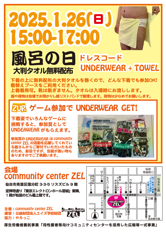 参加賞の各種UNDERWEARは、community center ZELの活動を応援してくれている皆さんからご寄付でいただいたもののため、新品ですが、包装が無い物もありますのでご了承願います。