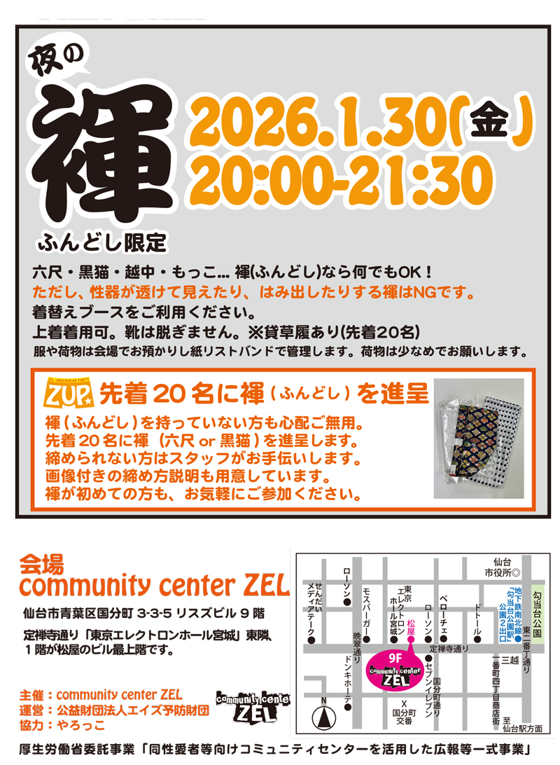褌(ふんどし)を持っていない方も心配ご無用。先着20名に褌(六尺or黒猫)を進呈します。